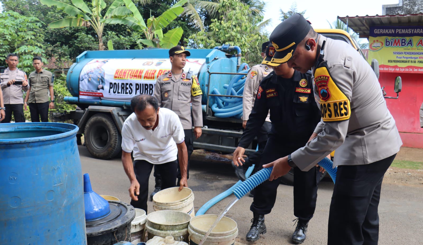 “Karena kondisi mengalami kekeringan maka kami dari Polres Purbalingga menyalurkan bantuan air bersih untuk warga di Desa Pasunggingan, Kecamatan Pengadegan, Kabupaten Purbalingga,” ucapnya.