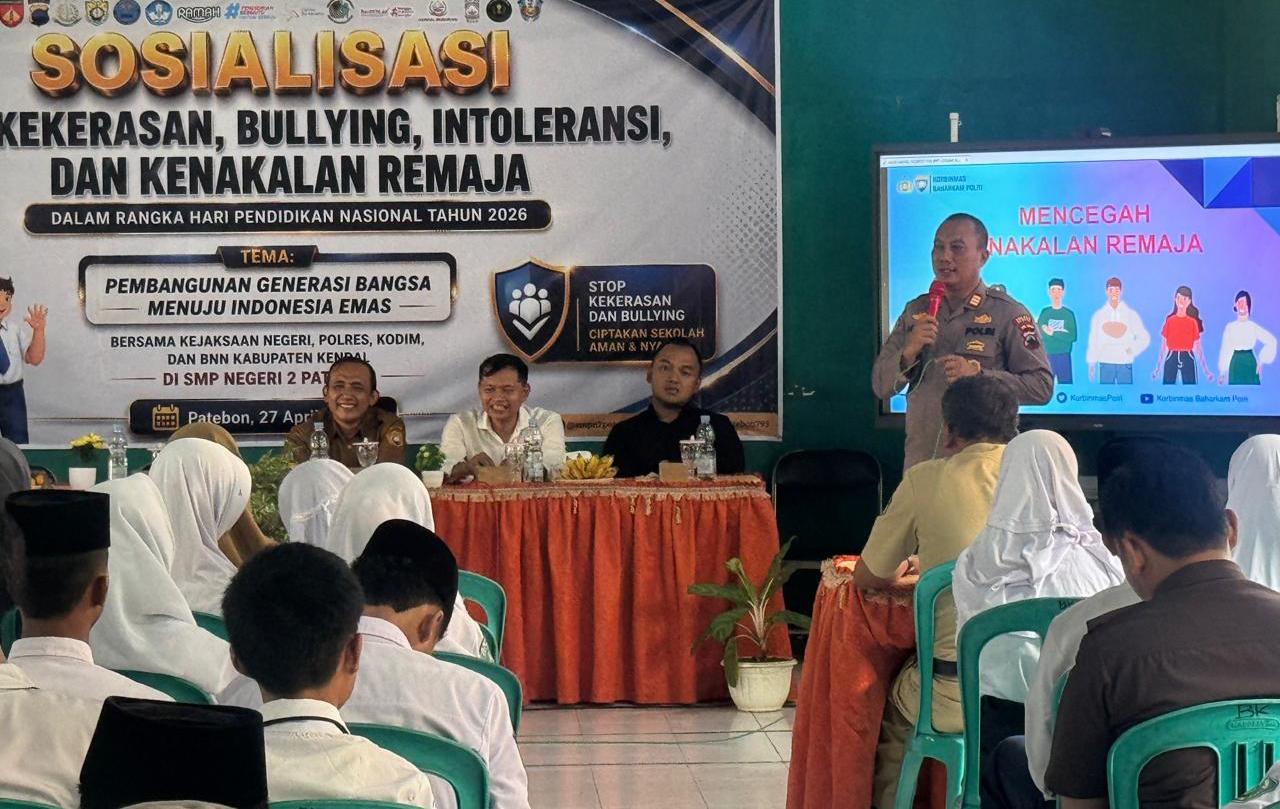 Sosialisasi anti kekerasan, perundungan (bullying), intoleransi, serta kenakalan remaja berlangsung di SMPN 2 Patebon, Kabupaten Kendal, Senin (27/4/2026) pukul 09.30 WIB.