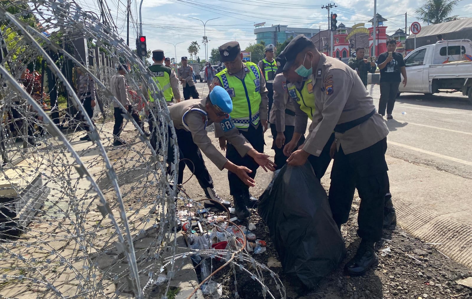 Sejumlah anggota terlihat menyapu halaman, mengumpulkan sampah, serta merapikan perlengkapan pengamanan di sekitar area Pengadilan Negeri Pati.