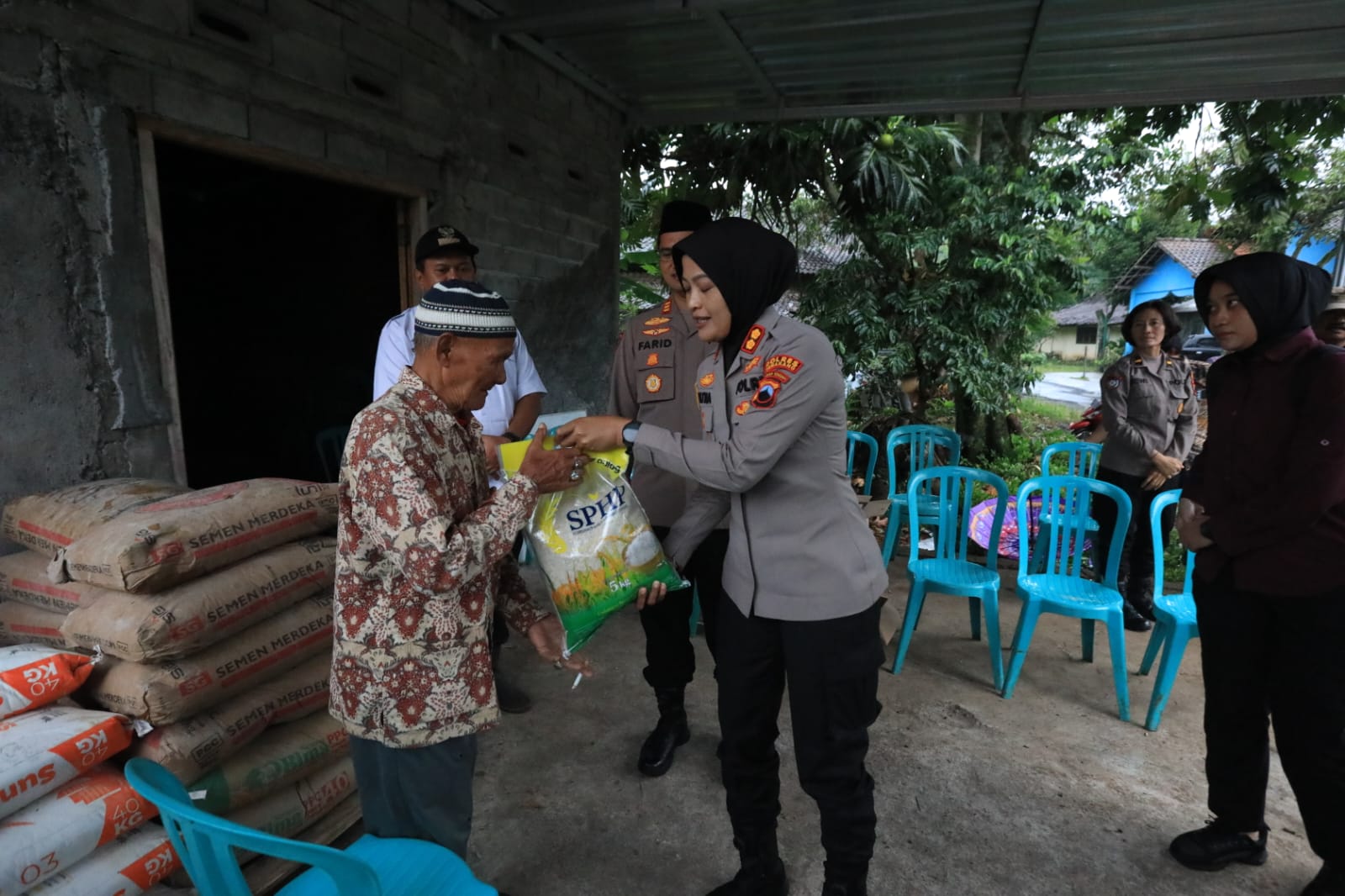 Di tempat ini, Kapolres Semarang menyerahkan bantuan berupa satu bak pasir dan delapan sak semen untuk membantu proses perbaikan rumah yang roboh akibat terjangan angin.