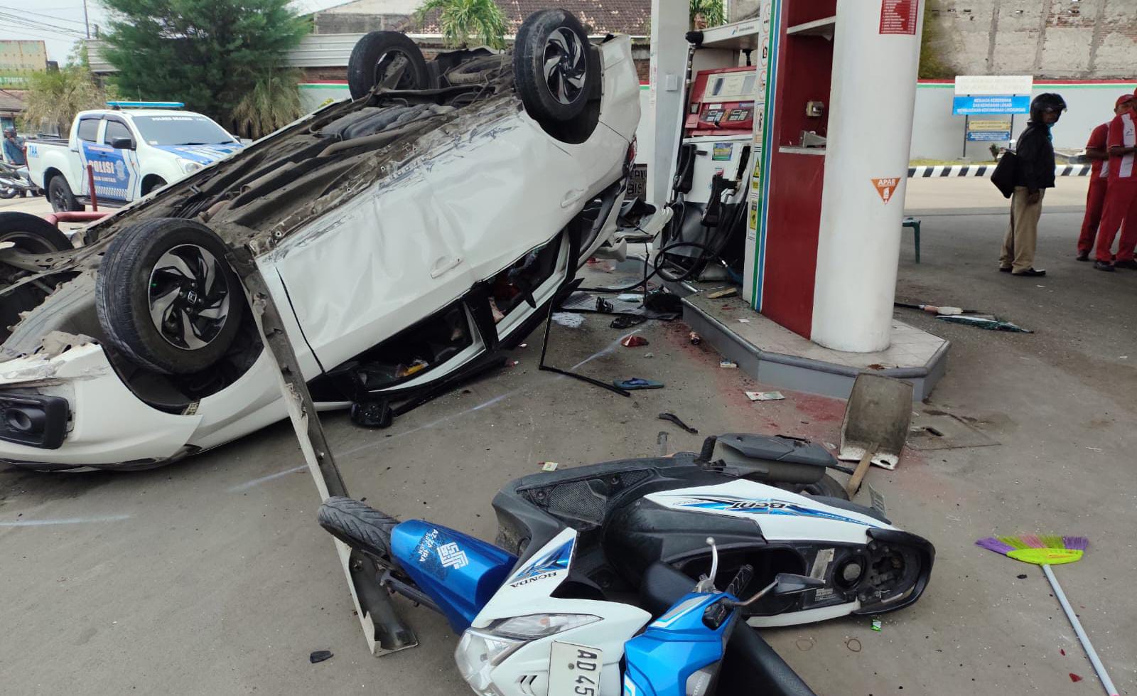 “Dalam posisi terguling, mobil membentur sepeda motor yang mengisi BBM serta operator SPBU yang berdiri di dekat dispenser,” jelas AKP Kukuh.