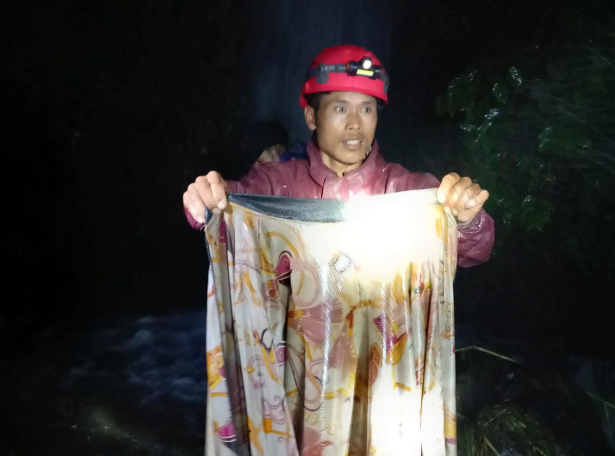 Pencarian lanjut hingga ke aliran sungai yang mulai surut. Warga kemudian menemukan kain dan jaket milik korban.
